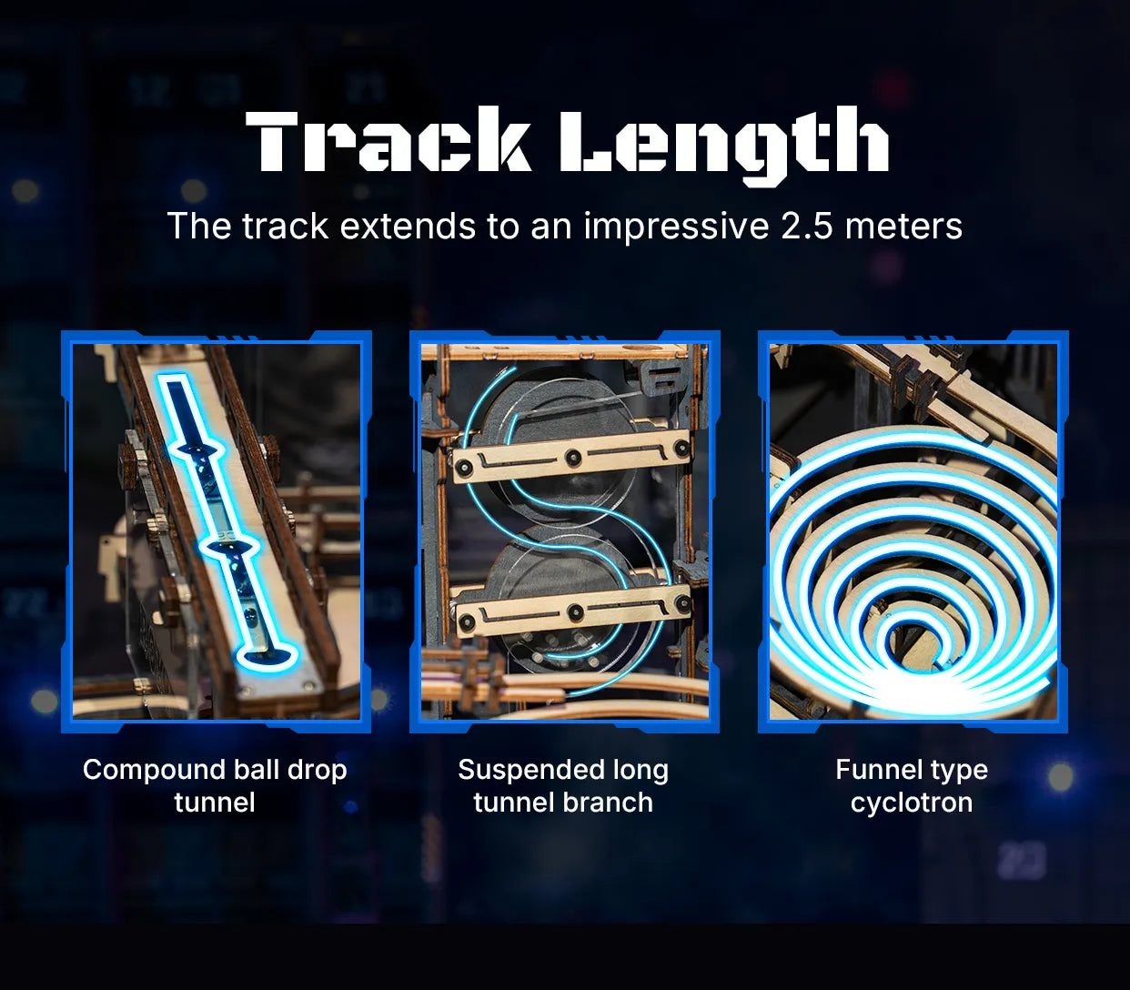 Break through material restrictions and incorporate high-transparent acrylic. Funnel-shaped track, the total length is extended to 2.5 meters. Shake the handle, the steel ball will reciprocate along the track, experience the creativity of precision machinery.