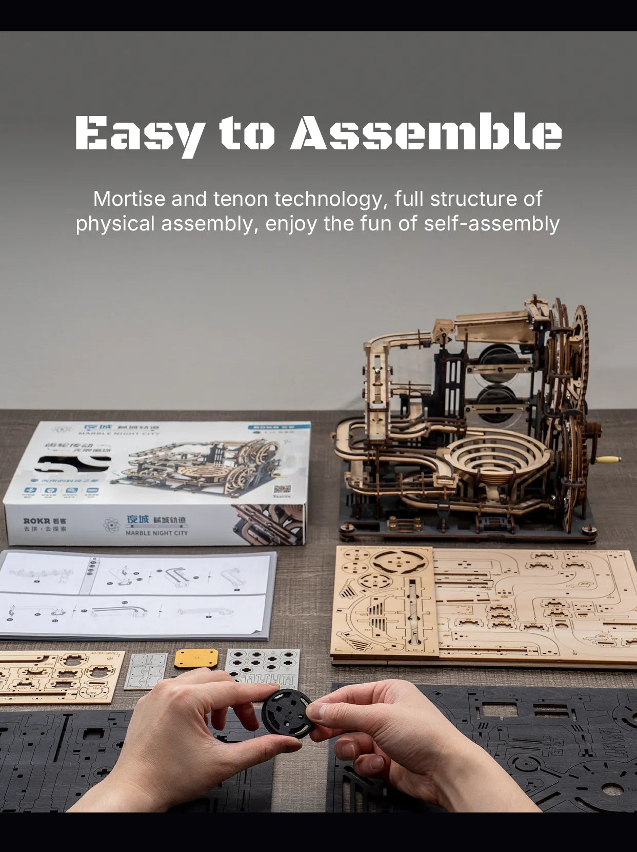 Rokr [Night City] Marble Run Set 5 Kinds 3D Wooden Puzzle DIY Model Building Block Kits Assembly Toy Gift for Teens Adult